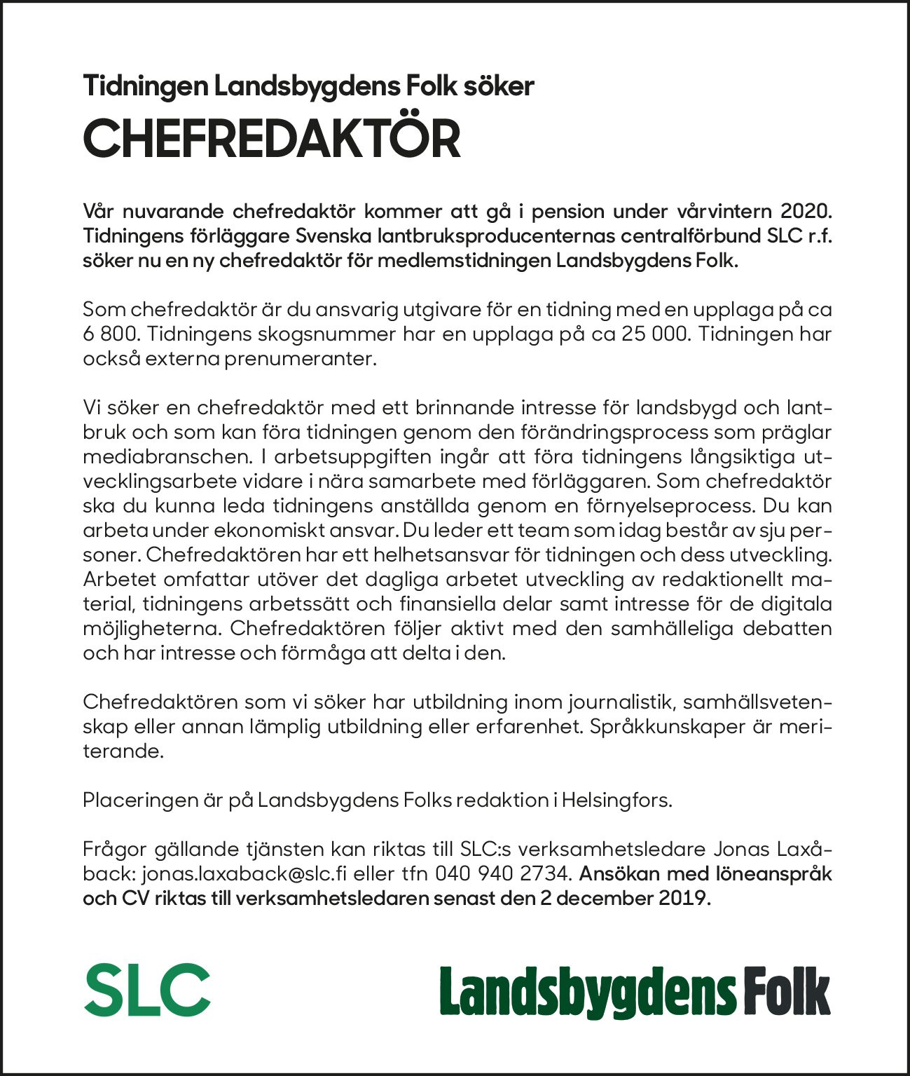 Vår nuvarande chefredaktör kommer att gå i pension under vårvintern 2020. Tidningens förläggare Svenska lantbruksproducenternas centralförbund SLC r.f. söker nu en ny chefredaktör för medlemstidningen Landsbygdens Folk.