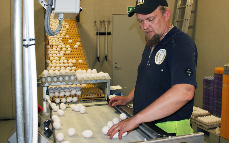 Äggen kommer till packeriet via ett transportband som löper genom hönshusets mittgång. Här gör Tobias Dahlblom en grov sortering och tar bort smutsiga och spruckna ägg.