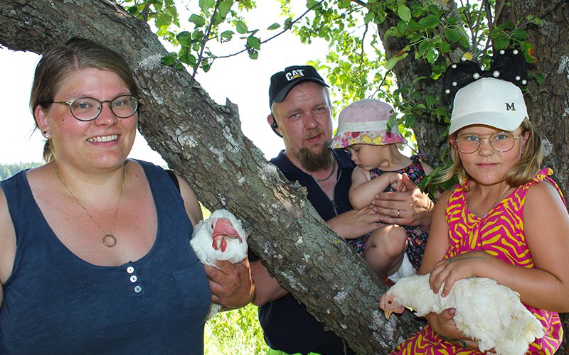 Erica och Tobias Dahlbloms liv kretsar kring barnen och djuren. Här hittar familjen skugga i dottern Claras klätterträd intill hönshuset. Lillasyster heter Nelly.