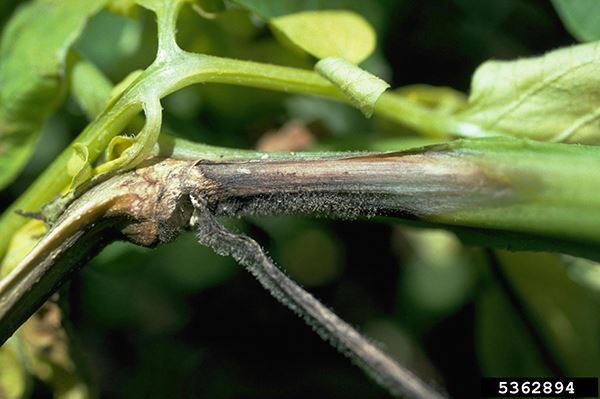 Svarta nekrosfläckar på stjälkarna och i bladvecken (foto Howard F. Schwartz, Colorado State University, Bugwood.org).