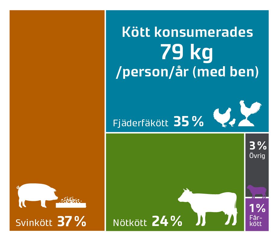 Enligt näringsbalansen var den totala konsumtionen av kött ifjol 79,4 kilo per person, inklusive vilt och innanmat. Jämfört med föregående år minskade totalkonsumtionen med ungefär en halv procent. Konsumtionsmängderna för kött anges i näringsbalansen med ben, det vill säga som uppslaktat kött. Konsumtionen av kött som tillagats motsvarar cirka 50 procent av mängden kött med ben.
