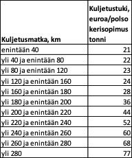 Liite 1. Tuottajajärjestöjen esitys kuljetustukitaulukoksi vuodelle 2022.